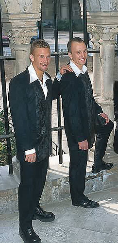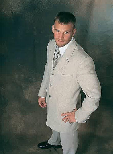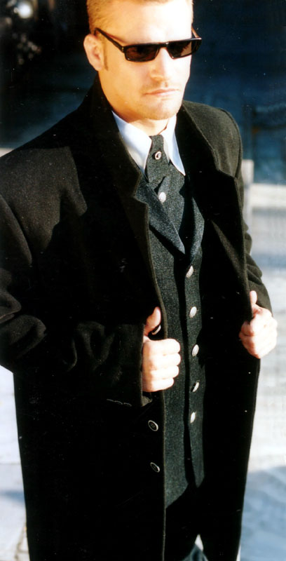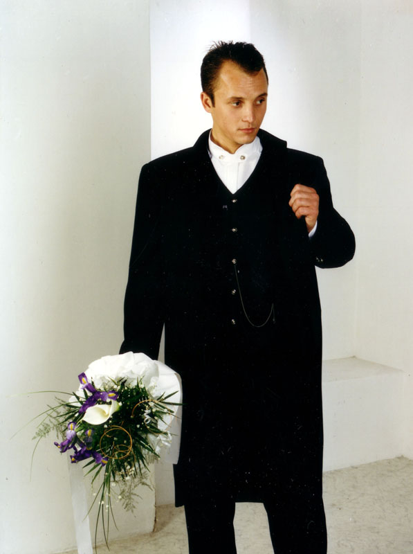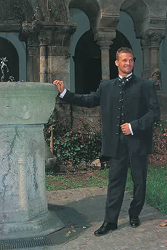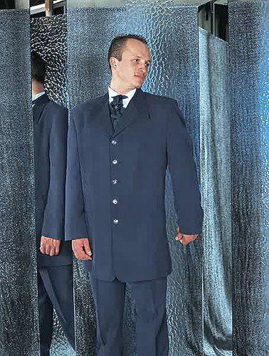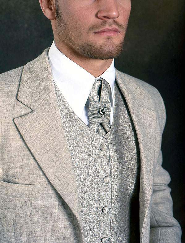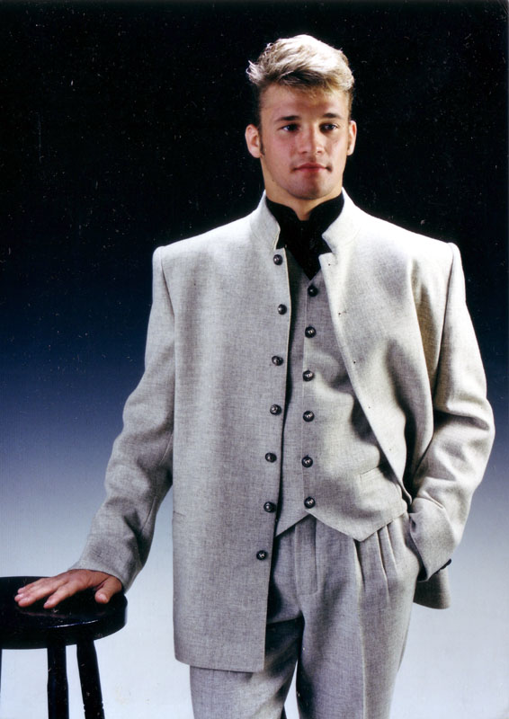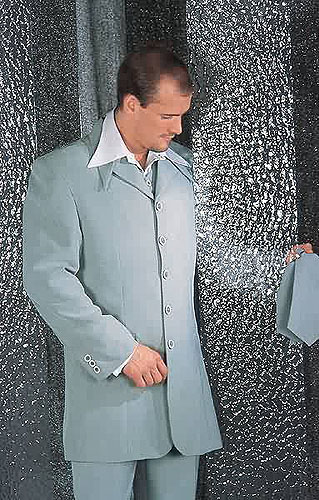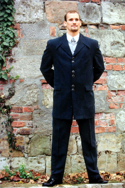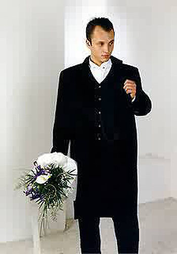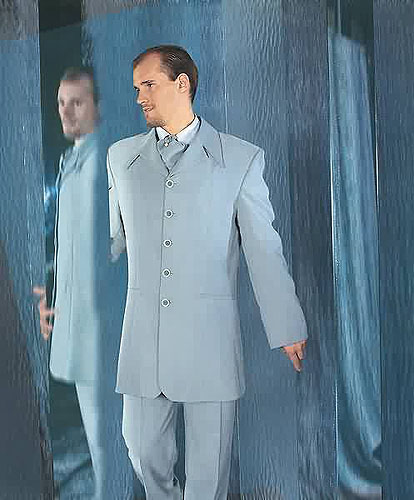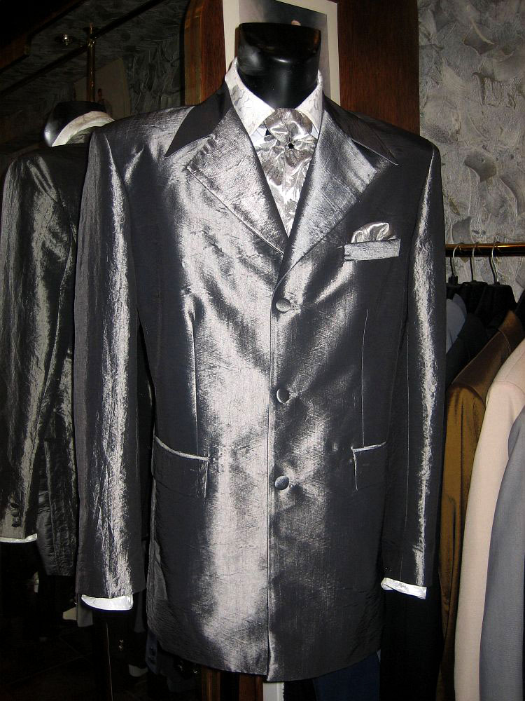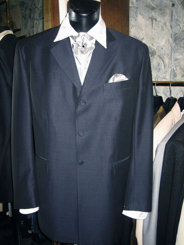 Azonos anyagból készült együttes. A kétrészes öltöny zakóból és nadrágból áll, a háromrészes pedig zakóból, nadrágból és mellényből.