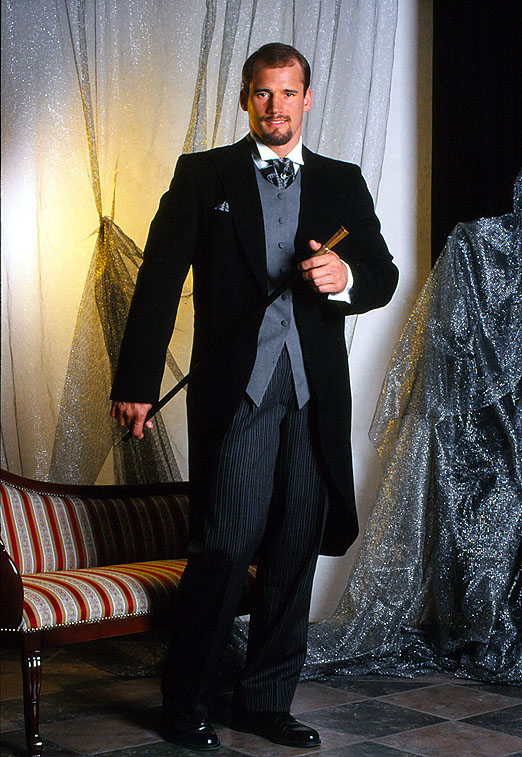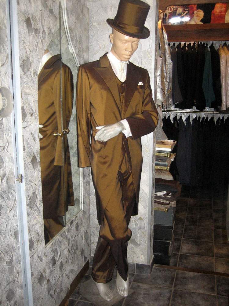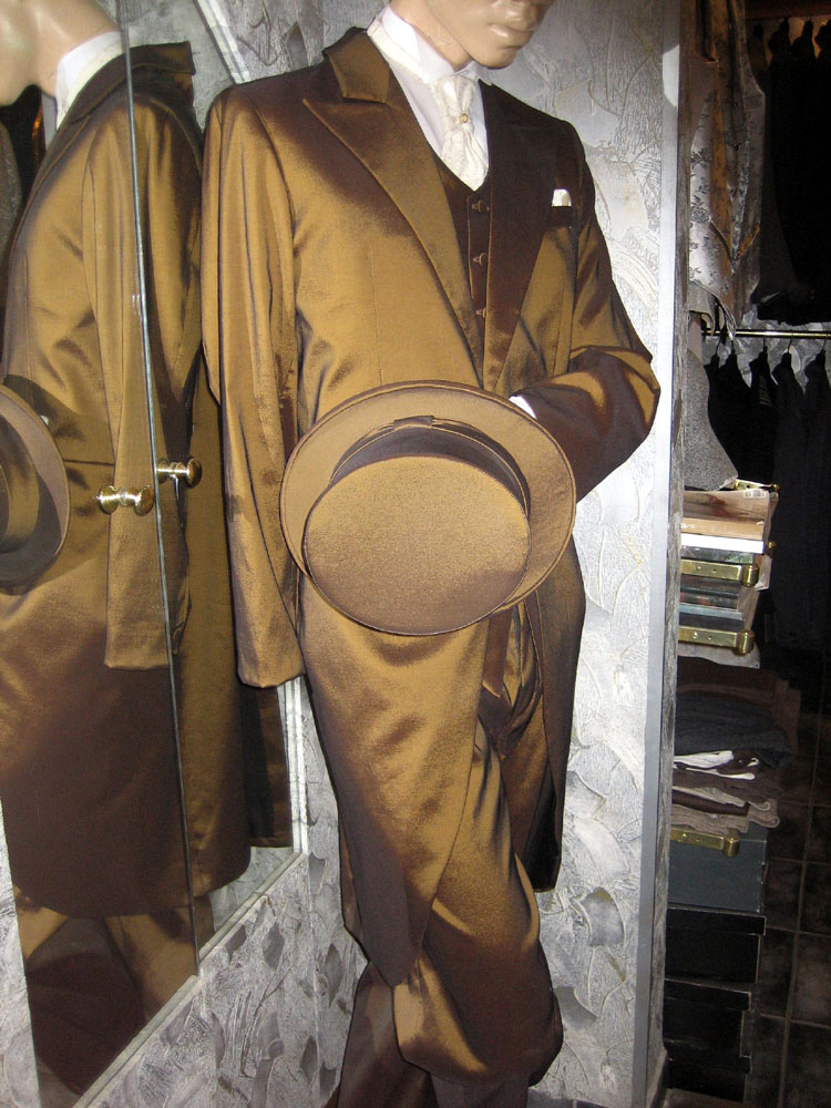 Kiegészítői: szürke mintás selyem sálnyakkendő, egyszínű szürke zsakett-mellény, szmoking-ing. Szürke vagy fekete cilinder, fekete cipő, glasszé-kesztyű. A színes zsaketthez a kiegészítők saját színében harmonizálnak.