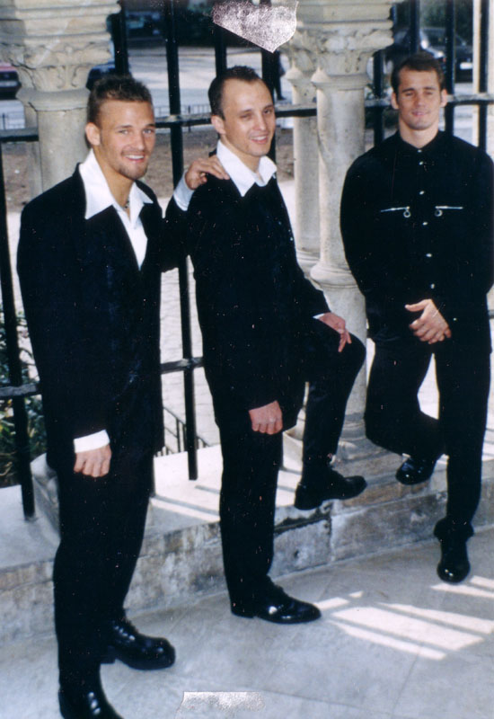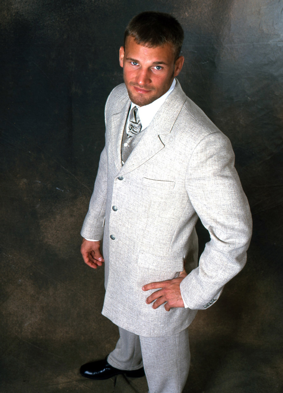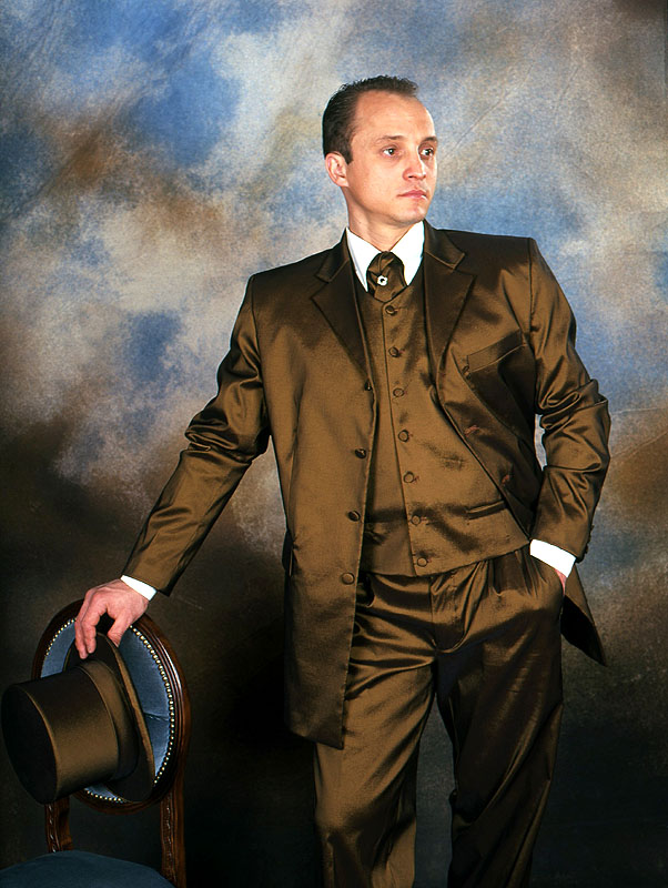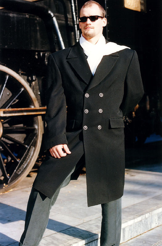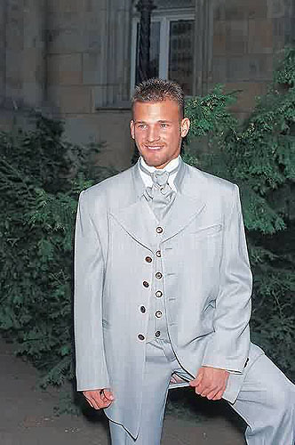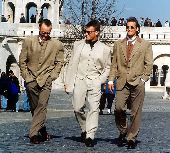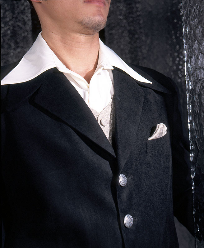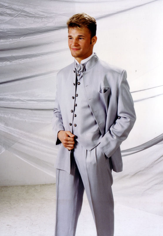 Azonos anyagból készült együttes. A kétrészes öltöny zakóból és nadrágból áll, a háromrészes pedig zakóból, nadrágból és mellényből.