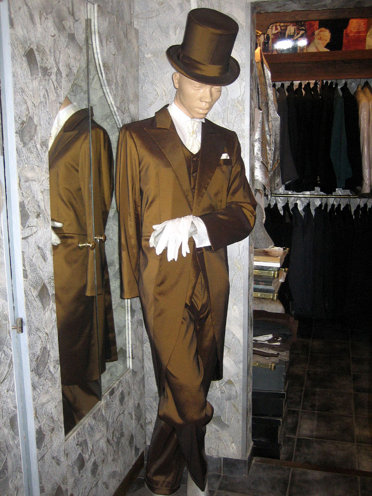 Kiegészítői: szürke mintás selyem sálnyakkendő, egyszínű szürke zsakett-mellény, szmoking-ing. Szürke vagy fekete cilinder, fekete cipő, glasszé-kesztyű. A színes zsaketthez a kiegészítők saját színében harmonizálnak.